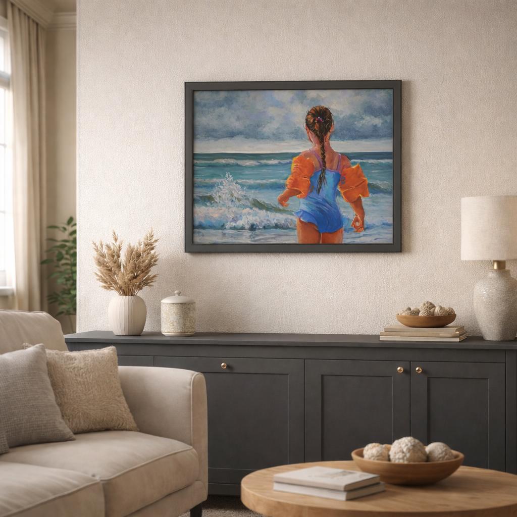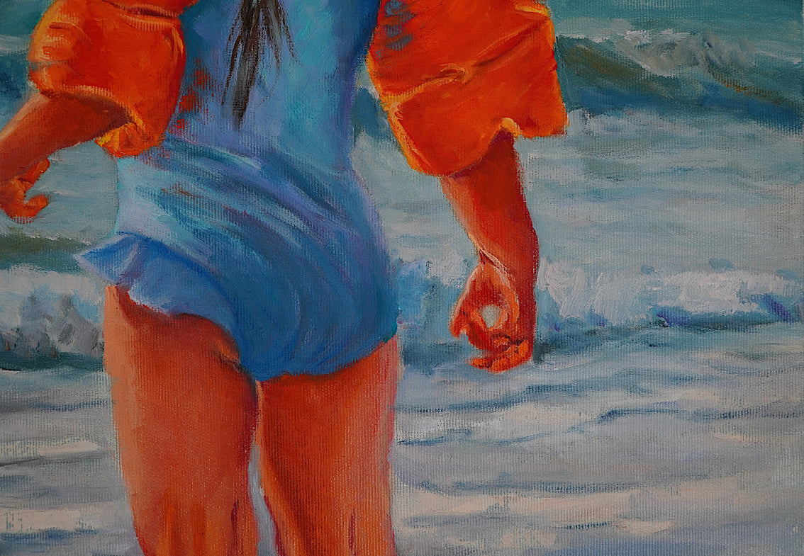 Das Motiv „Gesichert aber unsicher“ (Öl 50 x 60 cm) zeigt ein kleines Mädchen am Rand des Meeres. Ausgestattet mit Schwimmhilfen wirkt es gut vorbereitet – als hätte es alles, was es braucht, um ins Wasser zu gehen. Gleichzeitig steht es vor der Weite des Meeres, das für neue Aufgaben, Veränderungen und unbekannte Herausforderungen im Leben steht.